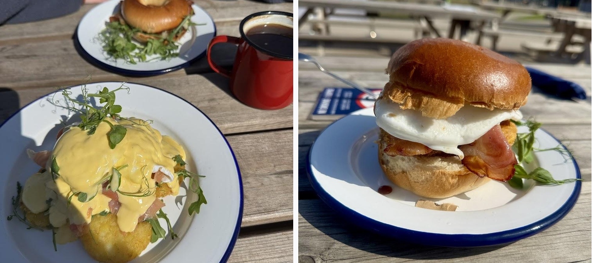Stopped for a late breakfast and the menu looked like the best in town. My partner had a bacon and brie bagel which was really good, the bun was quite sweet and it had a nice chutney in but it was quite greasy. I had the eggs royal rosti which was pretty big with 4 potato rostis, loads of salmon and two eggs. Was really good but i did find the hollandaise a bit flavourless and needing some more spicing. Location was really nice to sit in the sun and staff were friendly.